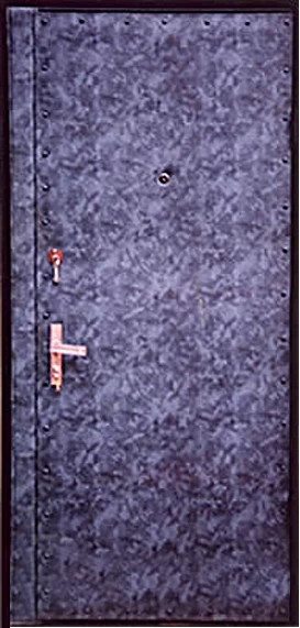 Технология производства дверей с винилискожей следующая. Варится стальной каркас двери, к нему приваривается металлическое полотно (возможно и без металлического листа), на него укладывается лист оргалита, слой утепляющего материала (в случае «объемной» обивки слой потолще, если «не объемна» - потоньше), на него укладывается винилискожа и делается рисунок.